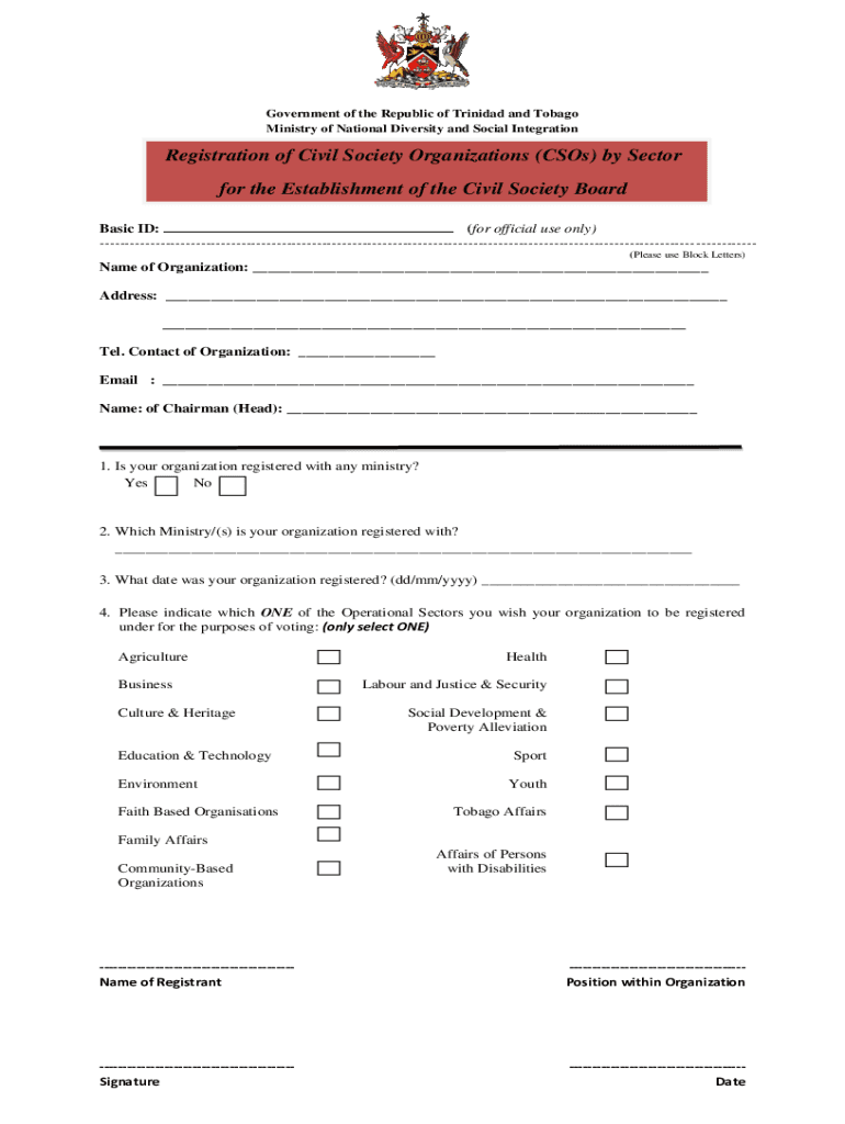 Government of the Republic of Trinidad and Tobago Ministry of National Diversity and Social IntegrationRegistration of Civil Society Organizations (CSOs) by Sector for the Establishment of the Civil