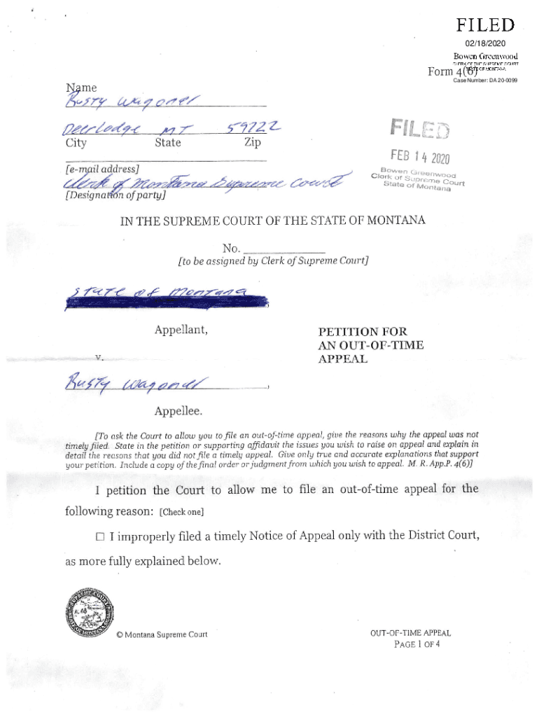 02/18/2020Form 4(6) Case Number: DA 200099Wne, fry 4.DEC, if “, ft 7StateCity5,72ZFILEDZipFEB 1 4 2020 em IL address DesignaBowen Clerk of Greenwood Supreme Court State of Montanaofparty IN THE