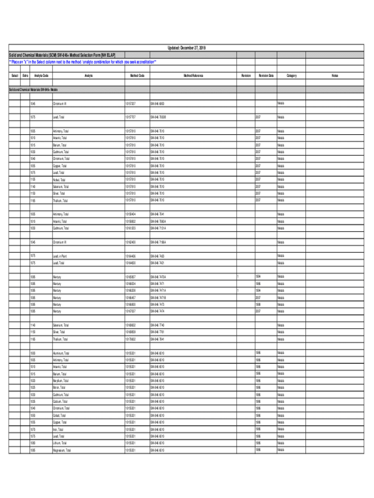 Updated: December 27, 2019, Solid and Chemical Materials (SCM) SW846+ Method Selection Form NH LAP **Place an “x in the Select column next to the method / analyte combination for which you seek