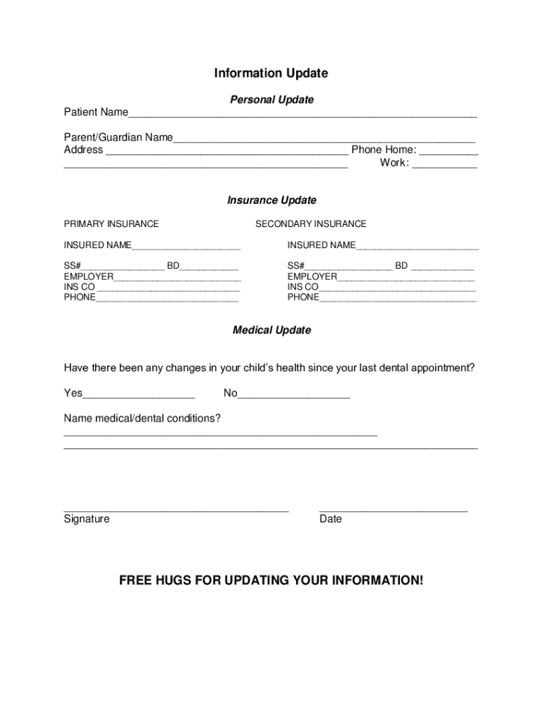 Information Update Personal Update Patient Name Parent/Guardian Name Address Phone Home: Work: Insurance Update PRIMARY INSURANCESECONDARY INSURANCEINSURED NAME INSURED NAME SS# BD EMPLOYER INS CO