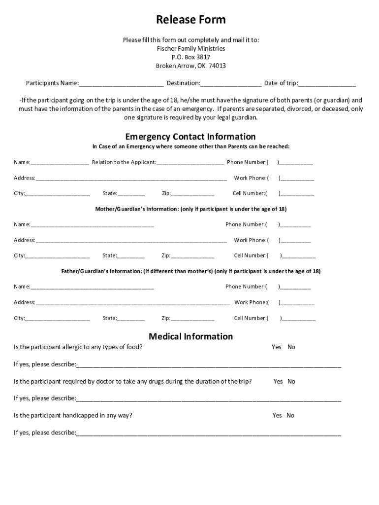 Release Form Please fill this form out completely and mail it to: Fischer Family Ministries P.O. Box 3817 Broken Arrow, OK 74013 Participants Name: Destination: Date of trip: If the participant going