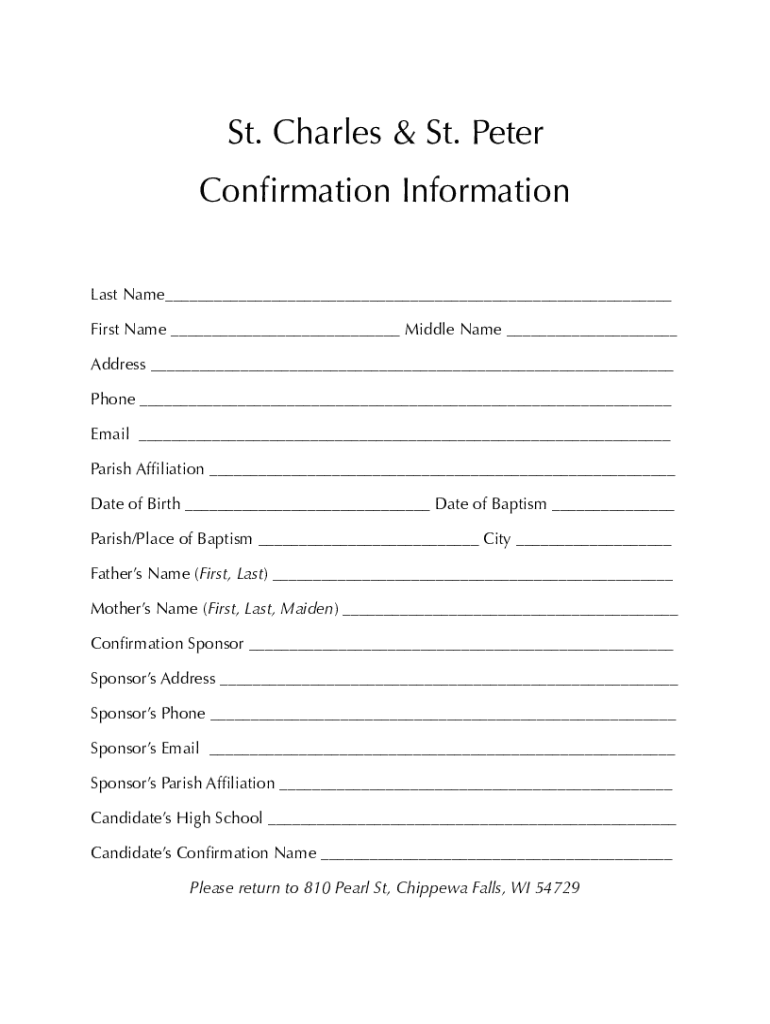St. Charles & St. Peter Confirmation Information Last Name First Name Middle Name Address Phone Email Parish Affiliation Date of Birth Date of Baptism Parish/Place of Baptism City Fathers Name (First,