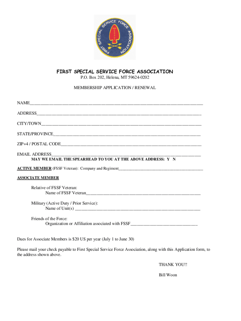 FIRST SPECIAL SERVICE FORCE ASSOCIATION P.O. Box 202, Helena, MT 596240202 MEMBERSHIP APPLICATION / RENEWALNAME ADDRESS CITY/TOWN STATE/PROVINCE ZIP+4 / POSTAL CODE EMAIL ADDRESS MAY WE EMAIL THE