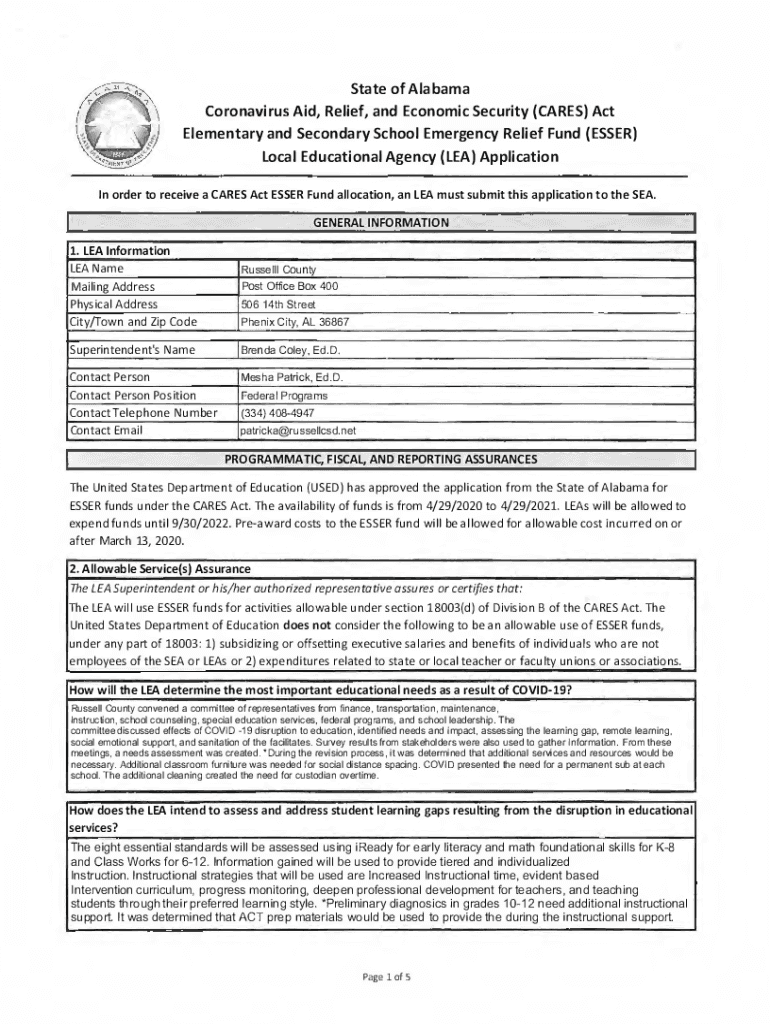 Y., ., l, .... v “state of Alabama Coronavirus Aid, Relief, and Economic Security CARES) Act Elementary and Secondary School Emergency Relief Fund LESSER) Local Educational Agency LEA) Application