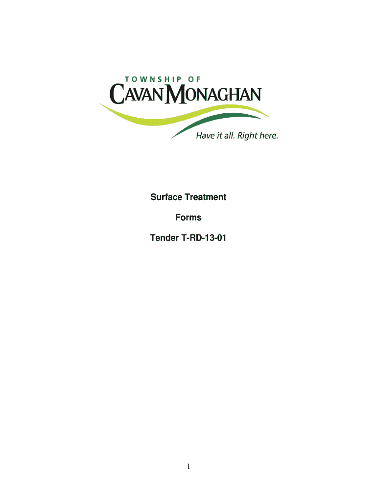 Surface Treatment Forms Tender T-RD-13-01 1 Surface Treatment Tender T-RD-13-01 Project: Surface Treatment Authority: Township of CAVAM Jonathan Contract Administrator: Township of CAVAM Jonathan