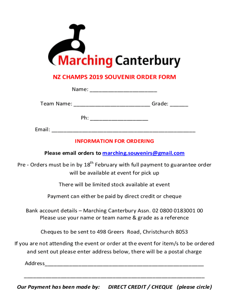 NZ CHAMPS 2019 SOUVENIR ORDER FORM Name: Team Name: Grade: pH: Email: INFORMATION FOR ORDERING Please email orders marching. Souvenirs gmail.com PRE Orders must be in by 18th February with full payment