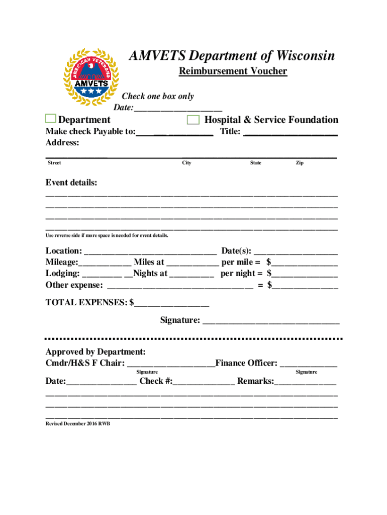 AMV ETS Department of Wisconsin Reimbursement Voucher Check one box only Date: xDepartmentMake check Payable to: Address: Hospital & Service Foundation Title: StreetCityStateZipEvent details: Use