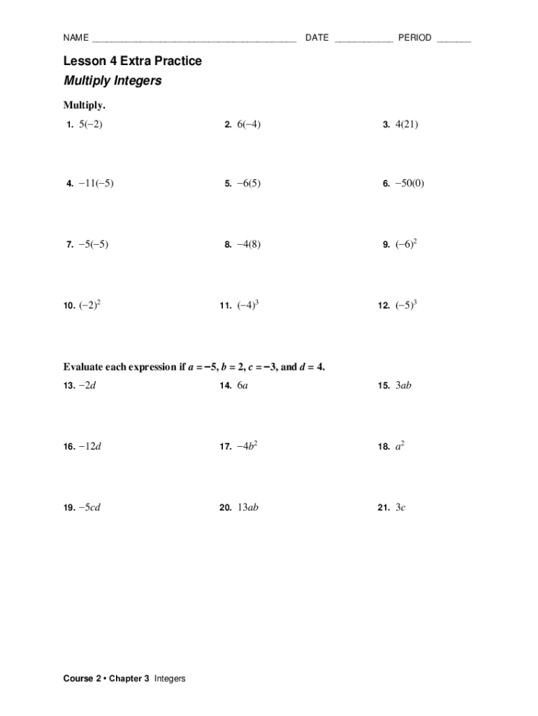 NAME DATE PERIOD Lesson 4 Extra Practice Multiply Integers Multiply. 1.5(2) 102.6(4) 243.4(21) 844.11(5) 555.6(5) 306.50(0) 07.5(5) 258.4(8) 329.(6)2 3611.(4)3 6412.(5)3 12510.(2)2 4Evaluate each