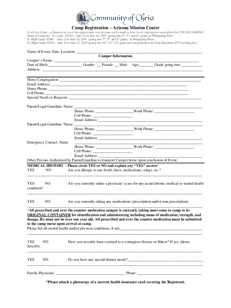 Camp Registration Arizona Mission Center Cost Free Camp a Donation to cover the approximate cost of camp can be made to your local congregation and labeled for YOUTH CAMPING Dates of Camp are: Jr.