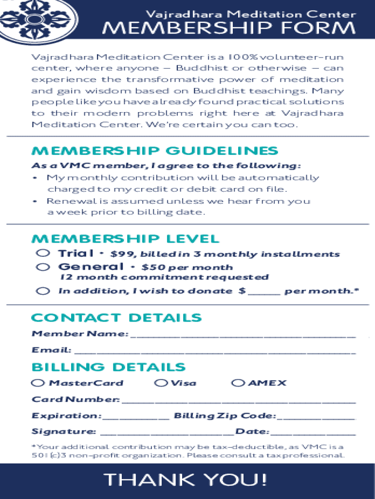Vasundhara Meditation CenterMEMBERSHIP FORM Vasundhara Meditation Center is a 100% volunteer run center, where anyone Buddhist or otherwise can experience the transformative power of meditation and