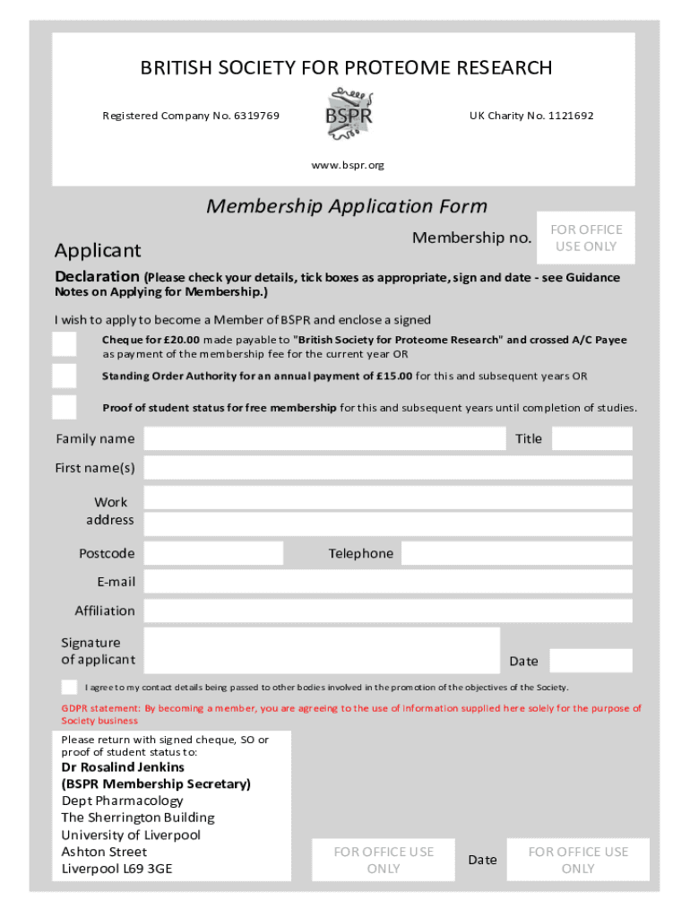 BRITISH SOCIETY FOR Protégé RESEARCH Registered Company No. 6319769UK Charity No. 1121692www.BAPR.membership Application Form Membership no. Applicator OFFICE USE ONLYDeclaration (Please check your