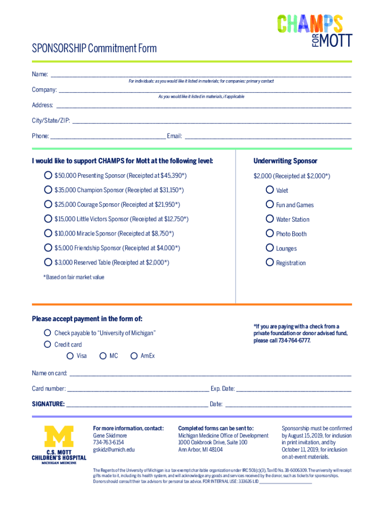 SPONSORSHIP Commitment Form Name: For individuals: as you would like it listed in materials; for companies: primary contactCompany: As you would like it listed in materials, if applicableAddress: