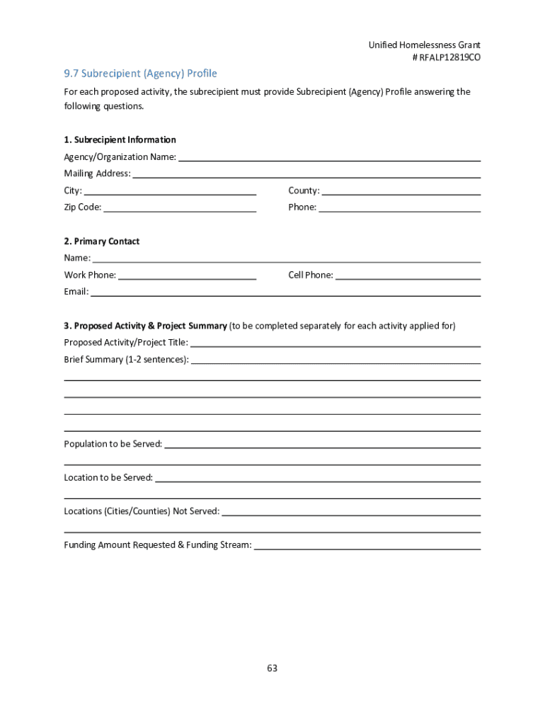 Unified Homelessness Grant # RFALP12819CO9.7 Subrecipient (Agency) Profile For each proposed activity, the subrecipient must provide Subrecipient (Agency) Profile answering the following questions.