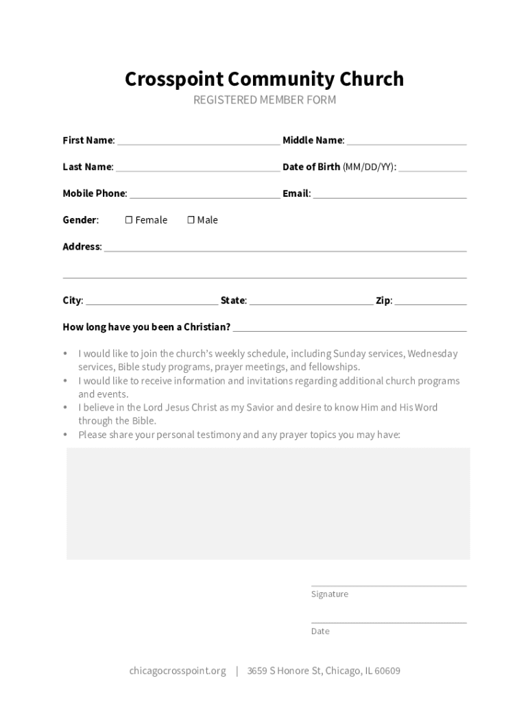 Cross point Community Church REGISTERED MEMBER Formalist Name:Middle Name:Last Name:Date of Birth (MM/DD/BY):Mobile Phone:Email:Gender: Female Headdress:City:State:Zip:How long have you been a Christian?