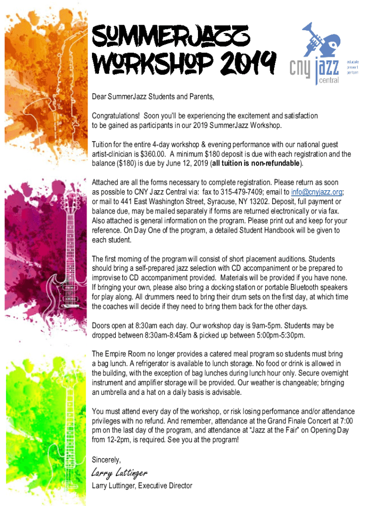 Dear SummerJazz Students and Parents, Congratulations! Soon you'll be experiencing the excitement and satisfaction to be gained as participants in our 2019 SummerJazz Workshop. Tuition for the entire