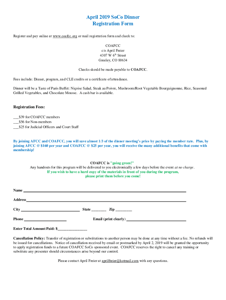 Get the free April 2019 SoCo Dinner Registration Form - COAFCC