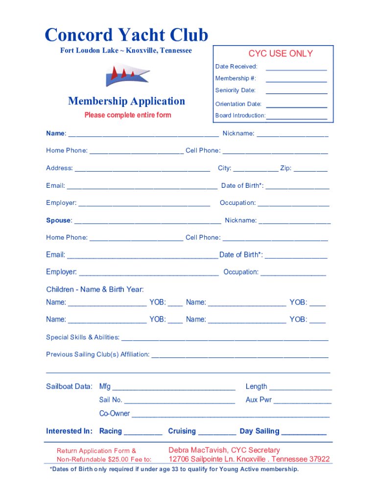 Concord Yacht Club Fort London Lake Knoxville, Tennessee USE ONLY Date Received: Membership #: Seniority Date:Membership Application Please complete entire reorientation Date: Board Introduction:Name:
