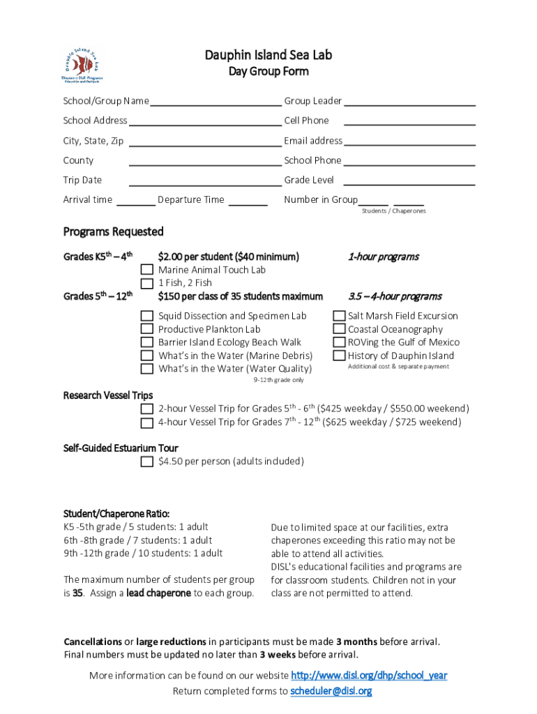 Dauphin Island Sea Lab Day Group Preschool/Group Numerous LeaderSchool Addressed Phonetic, State, Email addressCountySchool Phonetic Degrade LevelArrival predeparture Renumber in Group Students /