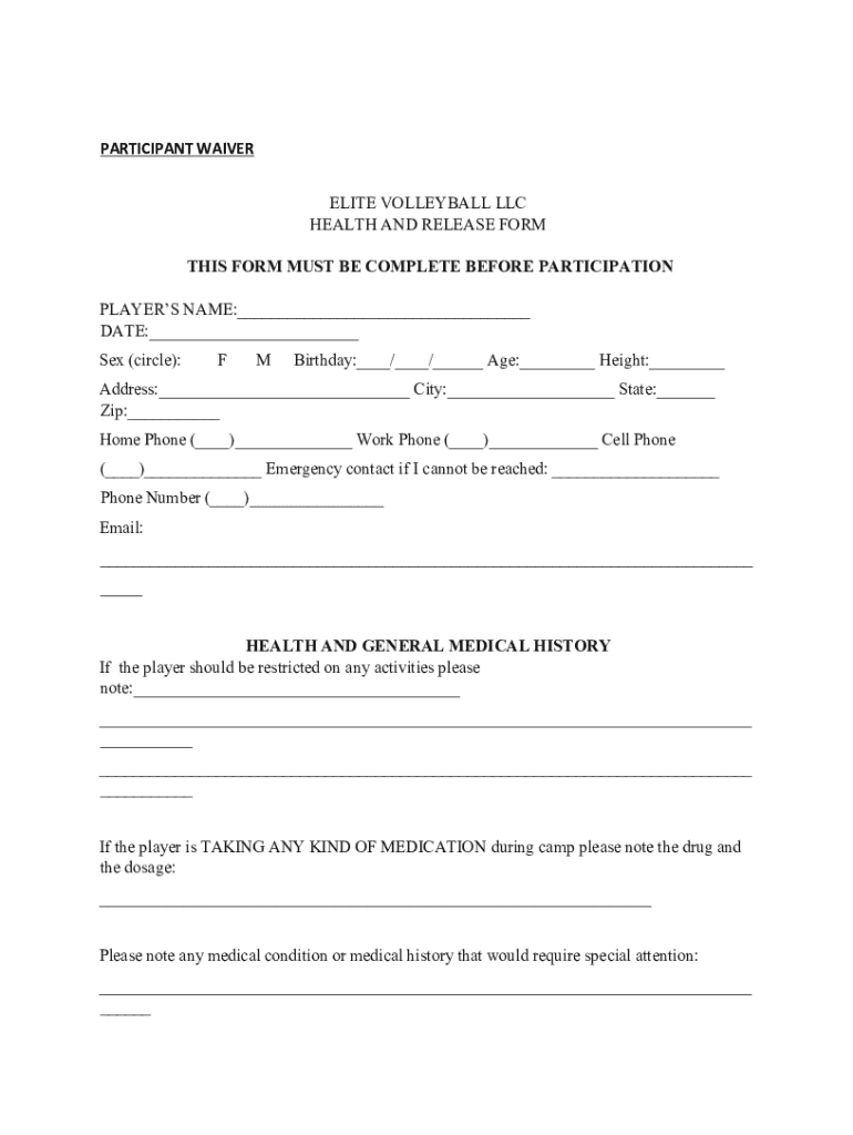 PARTICIPANT WAIVERELITE VOLLEYBALL LLC HEALTH AND RELEASE FORM THIS FORM MUST BE COMPLETE BEFORE PARTICIPATION PLAYERS NAME: DATE: Sex (circle):Birthday: / / Age: Height: Address: City: State: Zip: