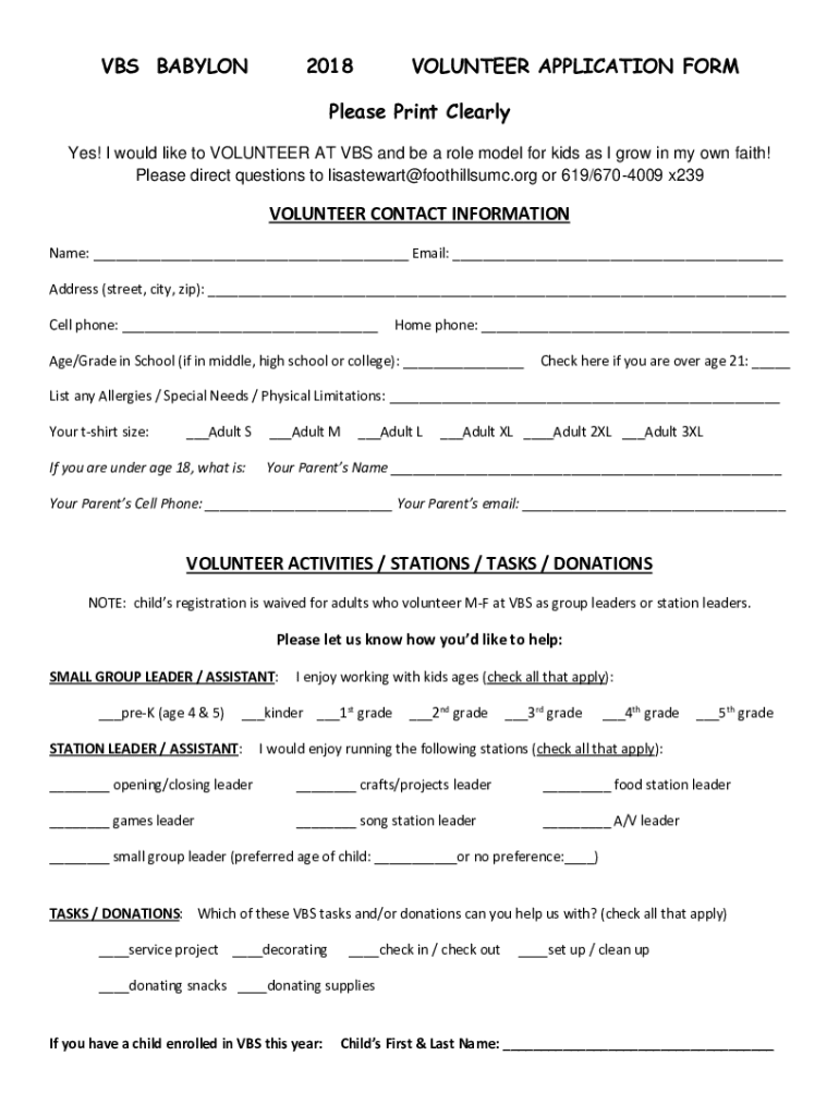 VBS BABYLON2018VOLUNTEER APPLICATION Formulas Print Clearly Yes! I would like to VOLUNTEER AT VBS and be a role model for kids as I grow in my own faith! Please direct questions to lisastewart foothills.org