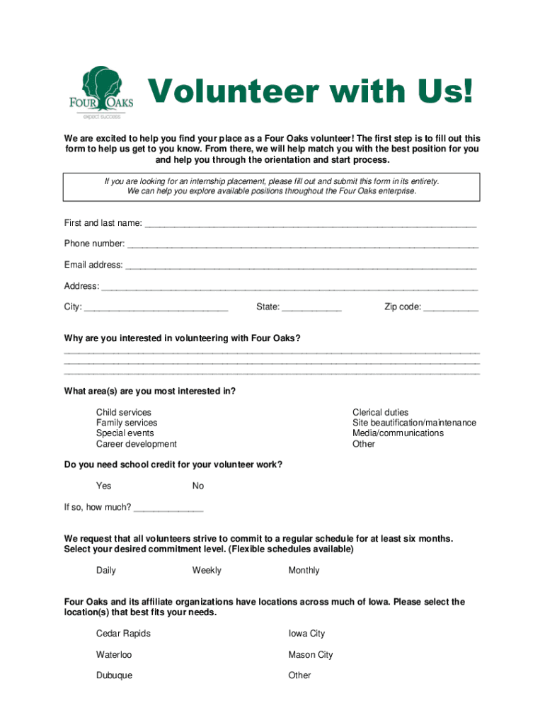 Volunteer with Us! We are excited to help you find your place as a Four Oaks volunteer! The first step is to fill out this form to help us get to your know. From there, we will help match you with