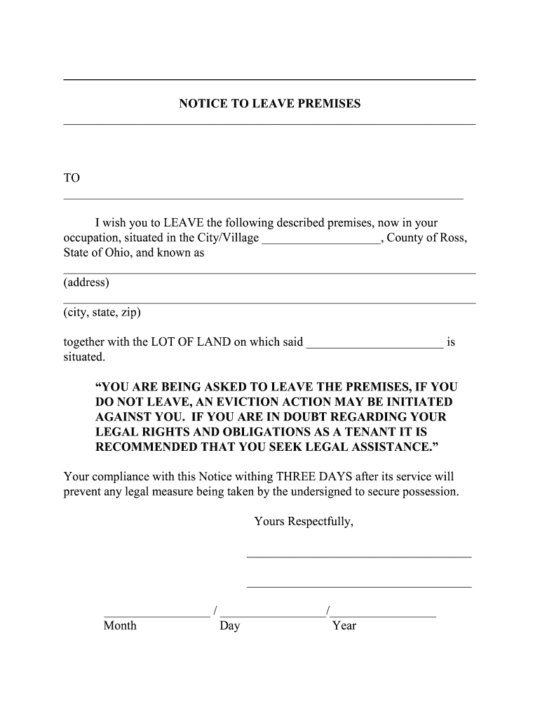 NOTICE TO LEAVE PREMISES TO I wish you to LEAVE the following described premises, now in your occupation, situated in the City/Village, County of Ross, State of Ohio, and known as (address) (city,