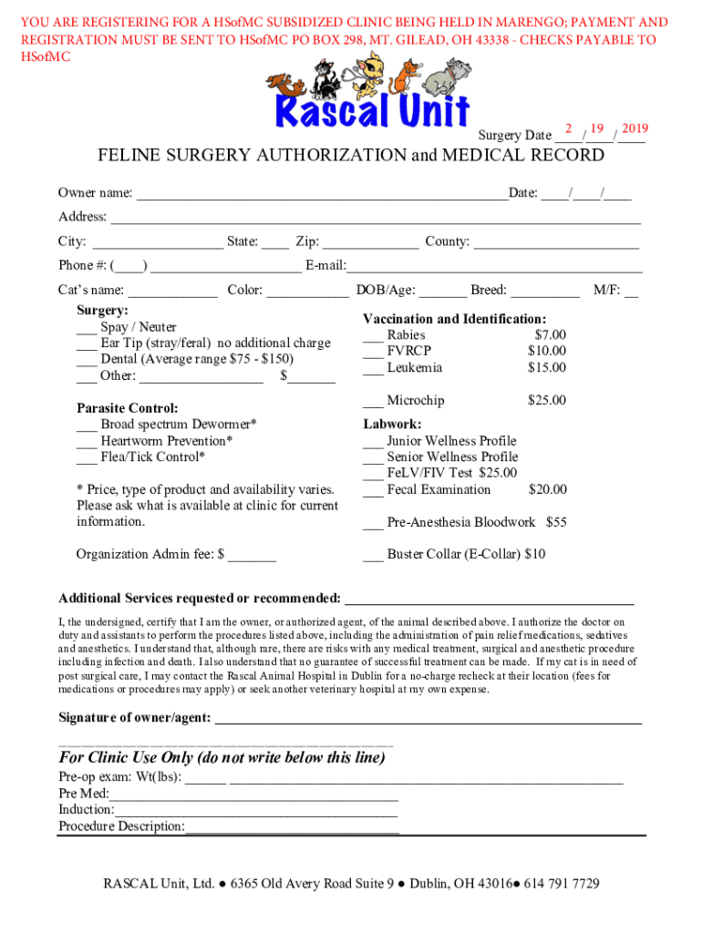 YOU ARE REGISTERING FOR A SFMC SUBSIDIZED CLINIC BEING HELD IN MANGO; PAYMENT AND REGISTRATION MUST BE SENT TO SFMC PO BOX 298, MT. GILEAD, OH 43338 CHECKS PAYABLE TO HSofMC2 19 2019 Surgery Date