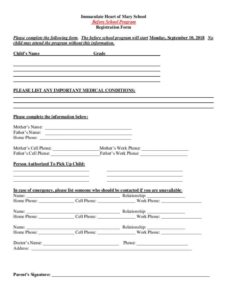 Immaculate Heart of Mary School Before School Program Registration Form Please complete the following form. The before school program will start Monday, September 10, 2018, No child may attend the