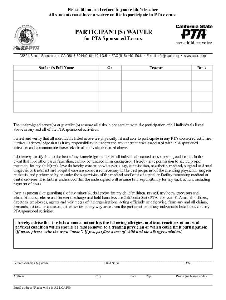 Please fill out and return to your children teacher. All students must have a waiver on file to participate in PTA events.PARTICIPANT(S) WAIVER for PTA Sponsored Events2327 L Street, Sacramento, CA