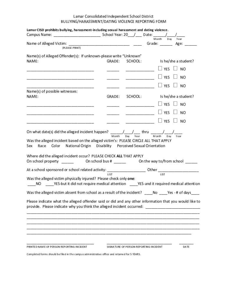 Lamar Consolidated Independent School District BULLYING/HARASSMENT/DATING VIOLENCE REPORTING FORM Lamar CSD prohibits bullying, harassment including sexual harassment and dating violence. Campus Name: