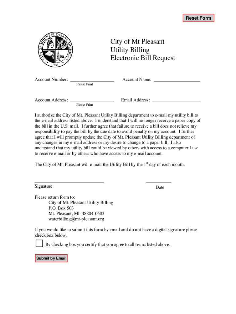 Reset Ferocity of Mt Pleasant Utility Billing Electronic Bill Request Account Number: Account Name: Please PrintAccount Address: Email Address: Please Print authorize the City of Mt. Pleasant Utility