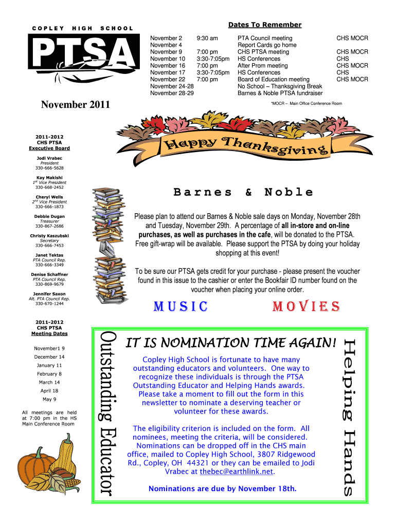 Dates To Remember November 2 November 4 November 9 November 10 November 16 November 17 November 22 November 24-28 November 28-29 9:30 am 7:00 pm 3:30-7:05pm 7:00 pm 3:30-7:05pm 7:00 pm PTA Council