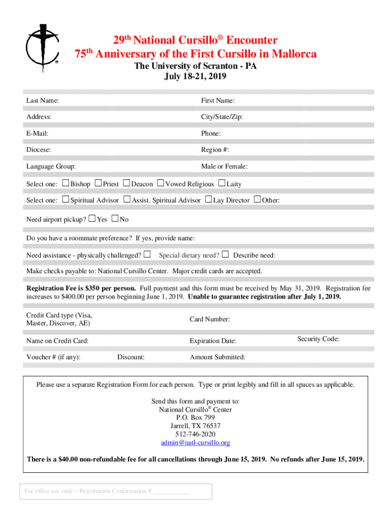 29th National Carrillo Encounter 75th Anniversary of the First Carrillo in Mallorca The University of Scranton PA July 1821, 2019 Last Name:First Name:Address:City/State/Zip:Email:Phone:Diocese:Region
