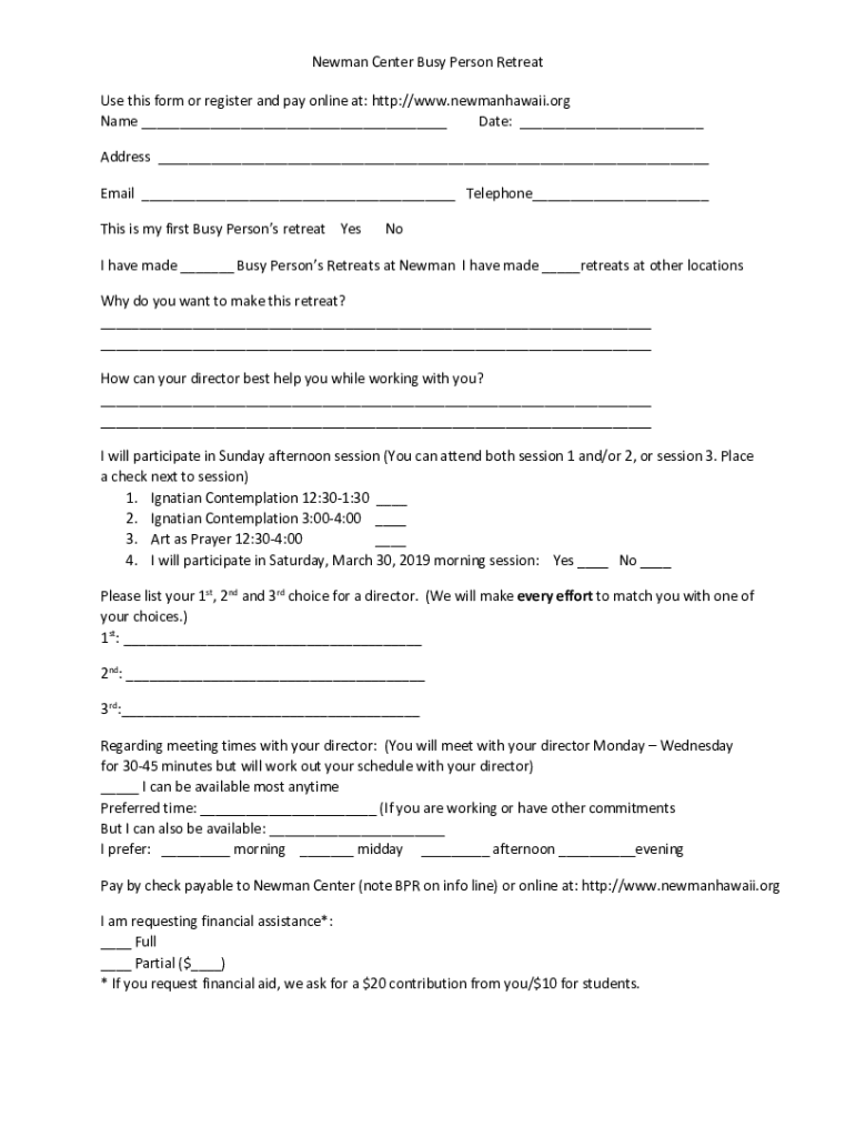Newman Center Busy Person Retreat Use this form or register and pay online at: http://www.newmanhawaii.org Name Date: Address Email Telephone This is my first Busy Persons retreat Yes have made Busy