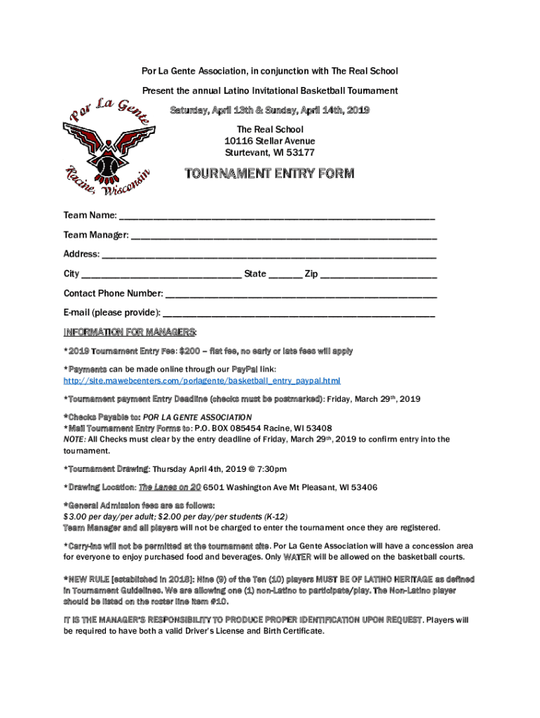 POR La Genre Association, in conjunction with The Real School Present the annual Latino Invitational Basketball Tournament Saturday, April 13th & Sunday, April 14th, 2019 The Real School 10116 Stellar