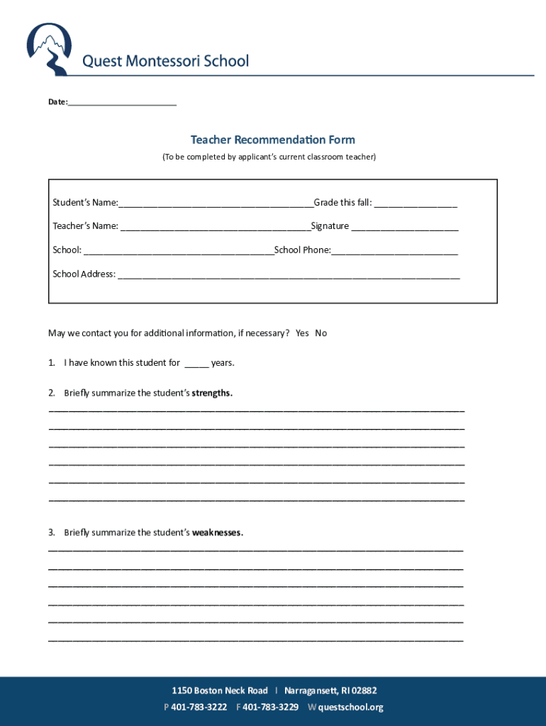Date:TeacherRecommenda0onForm(Tobecompletedbyapplicantscurrentclassroomteacher)StudentsName: Gradethisfall: TeachersName: Signature School: Schoolhouse: SchoolAddress: Maywecontactyouforaddi:onalinforma:on,