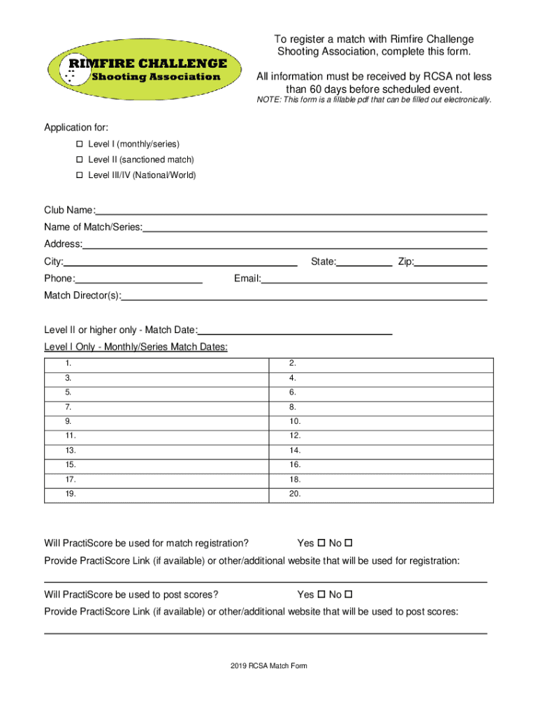 To register a match with Rimfire Challenge Shooting Association, complete this form. All information must be received by ROSA not less than 60 days before scheduled event. NOTE: This form is a fillable