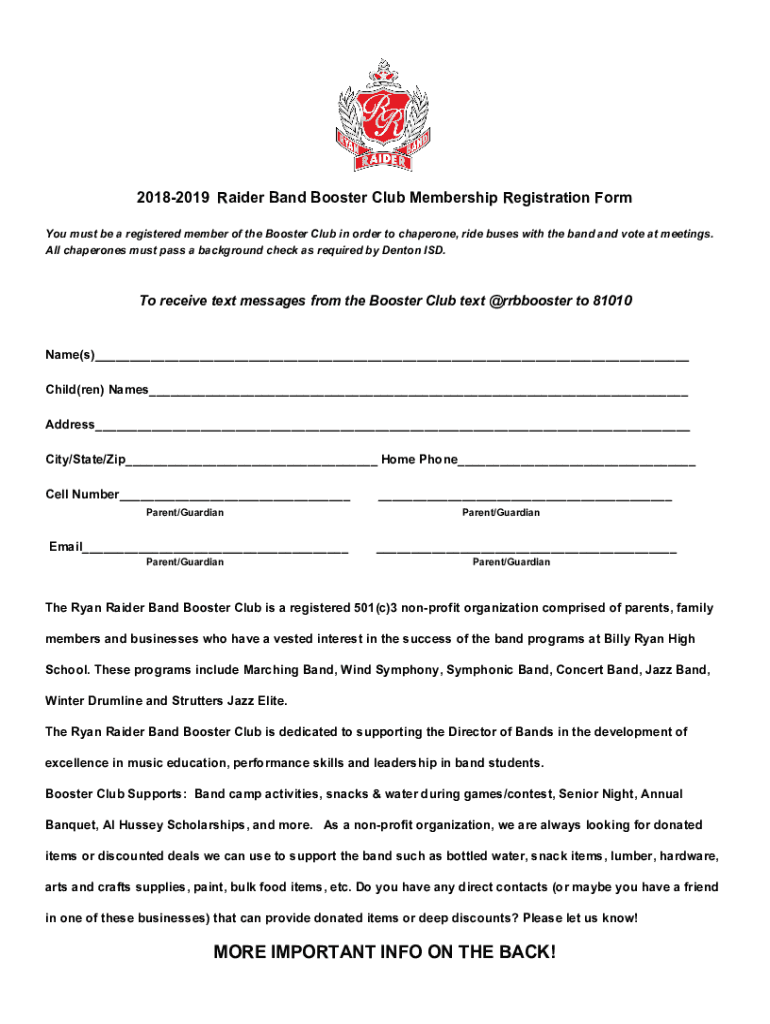 20182019 Raider Band Booster Club Membership Registration Form You must be a registered member of the Booster Club in order to chaperone, ride buses with the band and vote at meetings. All chaperones