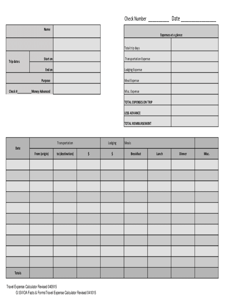 Check Number Date Name Expenses at a glance Total trip days Trip datesStart transportation Expensed lodging ExpensePurposeMeal ExpenseCheck # Money AdvancedMisc. Expense TOTAL EXPENSES ON TRIP LESS