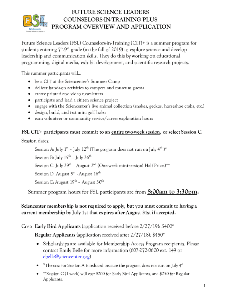 FUTURE SCIENCE LEADERS COUNSELORSINTRAINING PLUS PROGRAM OVERVIEW AND APPLICATION Future Science Leaders (SL) CounselorsinTraining (CIT)+ is a summer program for students entering 7th9th grade (in