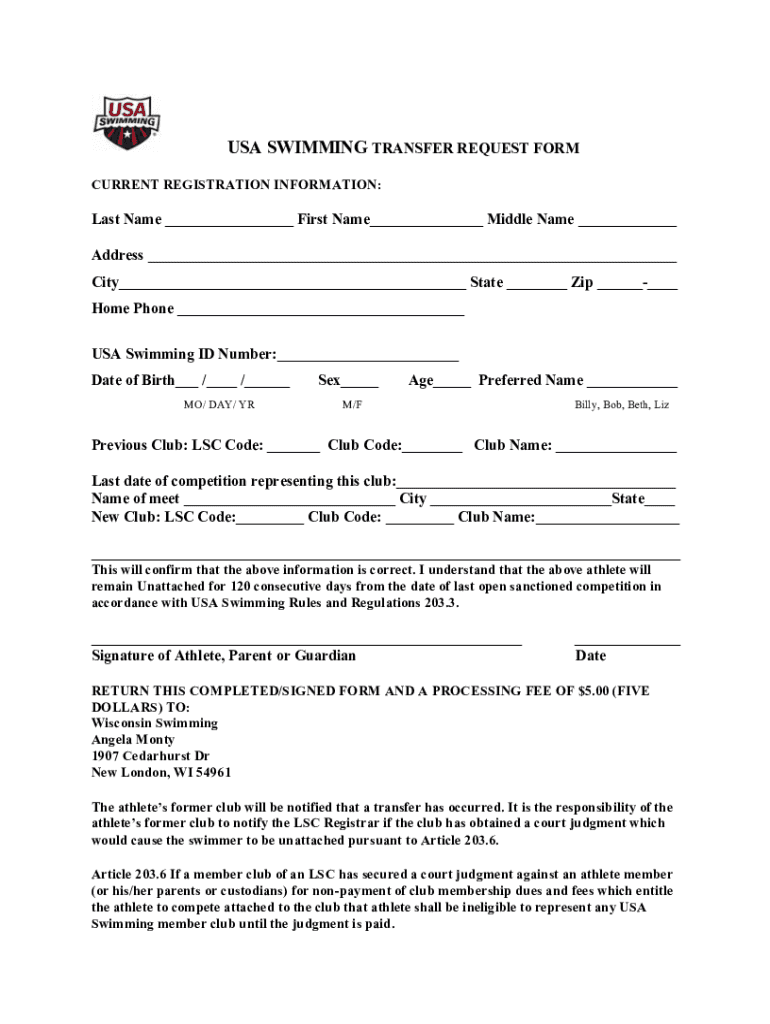 Swimmers who are members of USA Swimming and wish to transfer from one club to another need the USA Swimming transfer request.