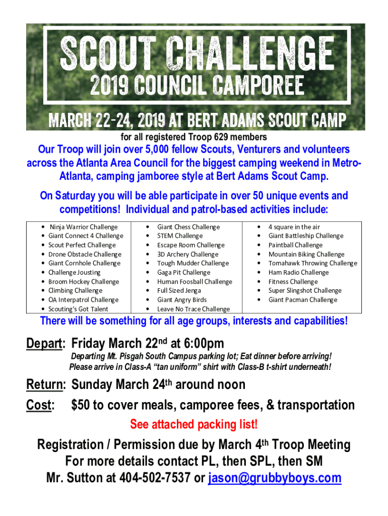 For all registered Troop 629 members Troop will join over 5,000 fellow Scouts, Ventures and volunteers across the Atlanta Area Council for the biggest camping weekend in Metro Atlanta, camping jamboree