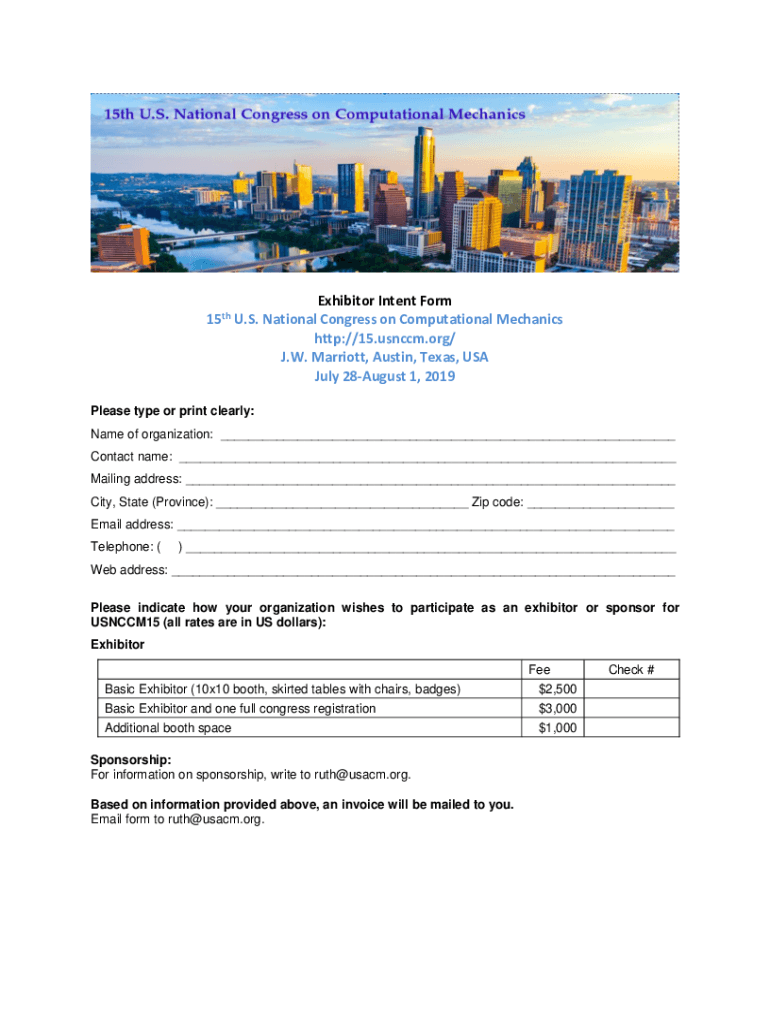 Exhibitor Intent Form 15th U.S. National Congress on Computational Mechanics http://15.usnccm.org/ J.W. Marriott, Austin, Texas, USA July 28August 1, 2019 Please type or print clearly: Name of organization: