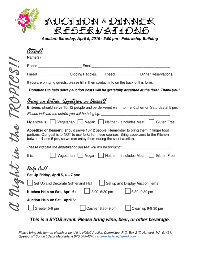 & Auction: Saturday, April 6, 2019 5:00 pm Fellowship Building Night in the TROPICS!! Attend! Name(s) Phone Email I need Bidding Paddles. I need Dinner Reservations. If you are bringing guests, please