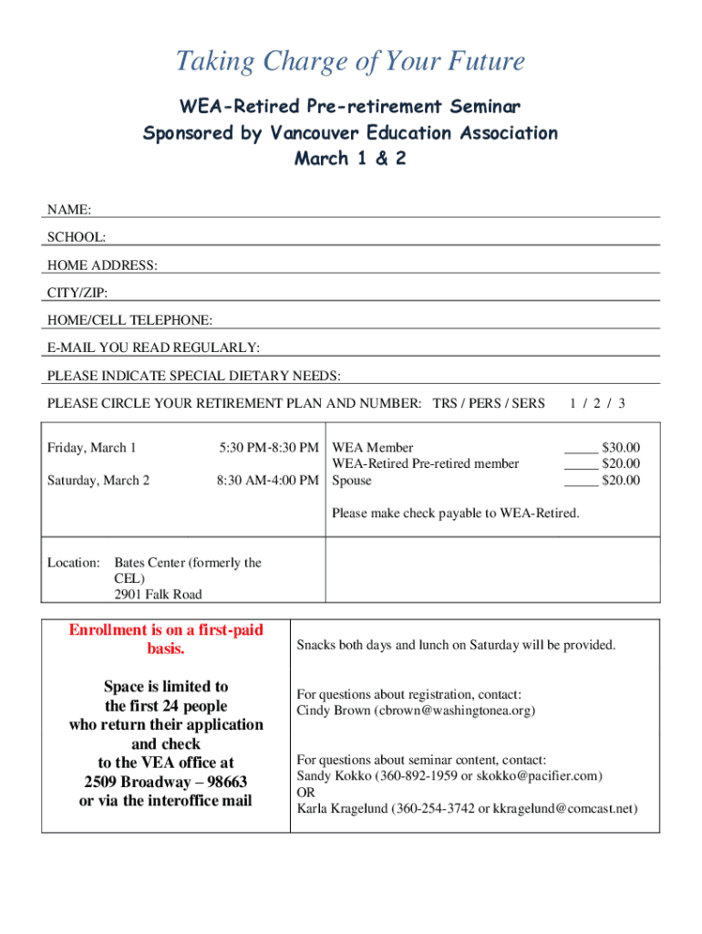 Taking Charge of Your Future Retired Retirement SeminarSponsored by Vancouver Education Association March 1 & 2 Names: SCHOOL: HOME ADDRESS: CITY/ZIP: HOME/CELL TELEPHONE: EMAIL YOU READ REGULARLY: