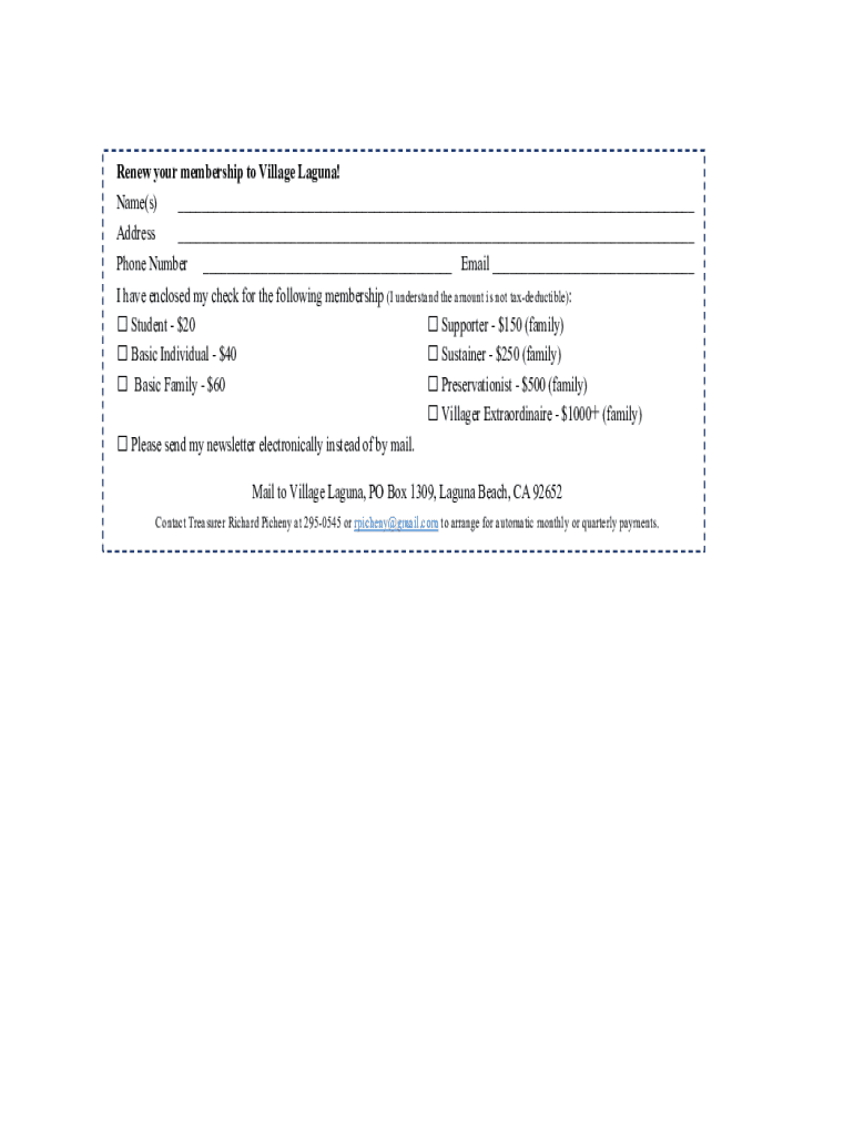 Renew your membership to Village Laguna! Name(s) Address Phone Number Email I have enclosed my check for the following membership (I understand the amount is not tax-deductible): Student $20 Supporter