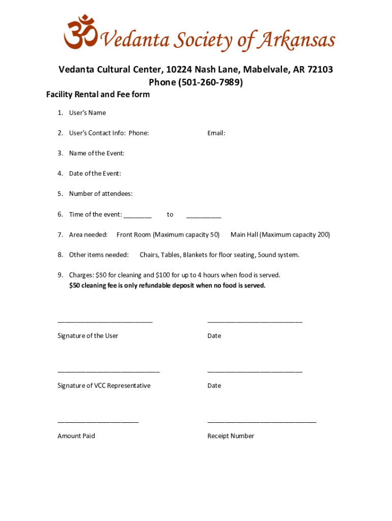 Vedanta Cultural Center, 10224 Nash Lane, Mabel vale, AR 72103 Phone (5012607989)Facility Rental and Fee form 1. Users Name 2. Users Contact Info: Phone:Email:3. Name of the Event: 4. Date of the