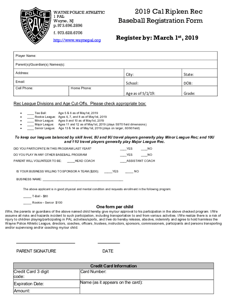 WAYNE POLICE ATHLETIC 1 PAL Wayne, NJ p.973.696.2896 f. 973.628.67062019 Cal Ripen Rec Baseball Registration Form Register by: March 1st, 2019http://www.waynepal.orgPlayer Name: Parent(s)/Guardian(s)