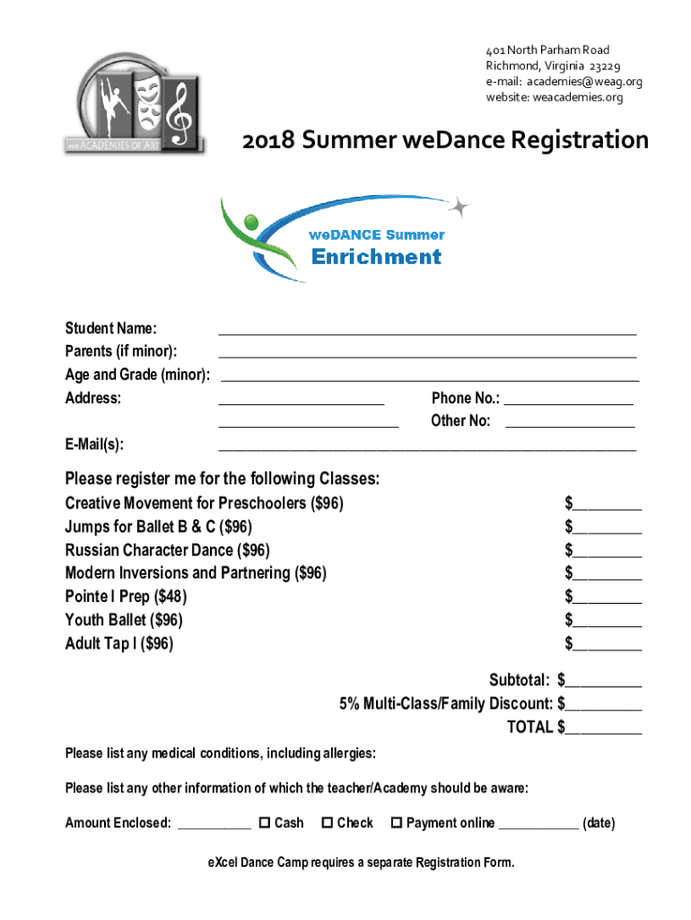 401 North Par ham Road Richmond, Virginia 23229 email: academies wear.org website: we academies.org2018 Summer dance RegistrationStudent Name: Parents (if minor): Age and Grade (minor): Address: Email(s):