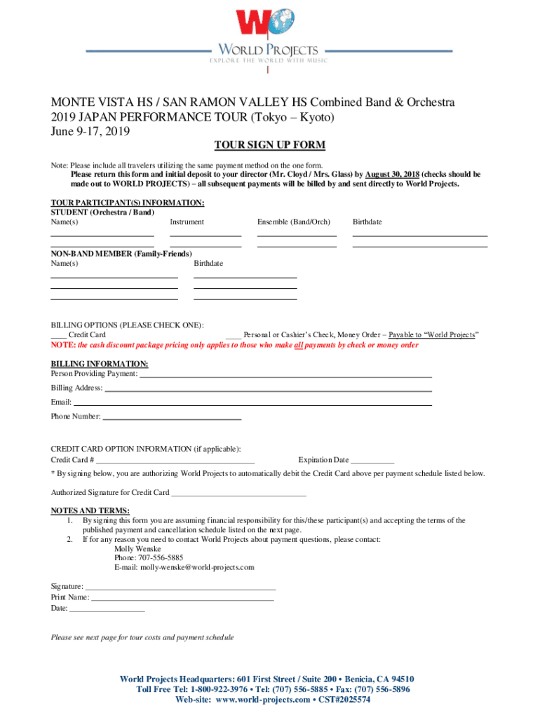 MONTE VISTA HS / SAN RAMON VALLEY HS Combined Band & Orchestra 2019 JAPAN PERFORMANCE TOUR (Tokyo Kyoto) June 917, 2019 TOUR SIGN UP FORM Note: Please include all travelers utilizing the same payment